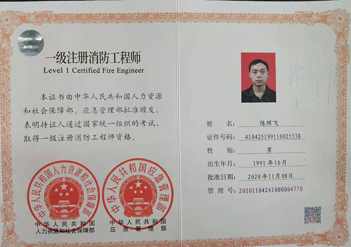 一級注冊消防工程師注冊證